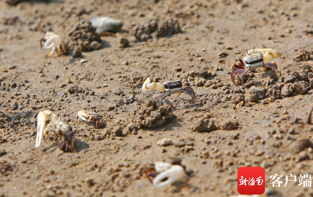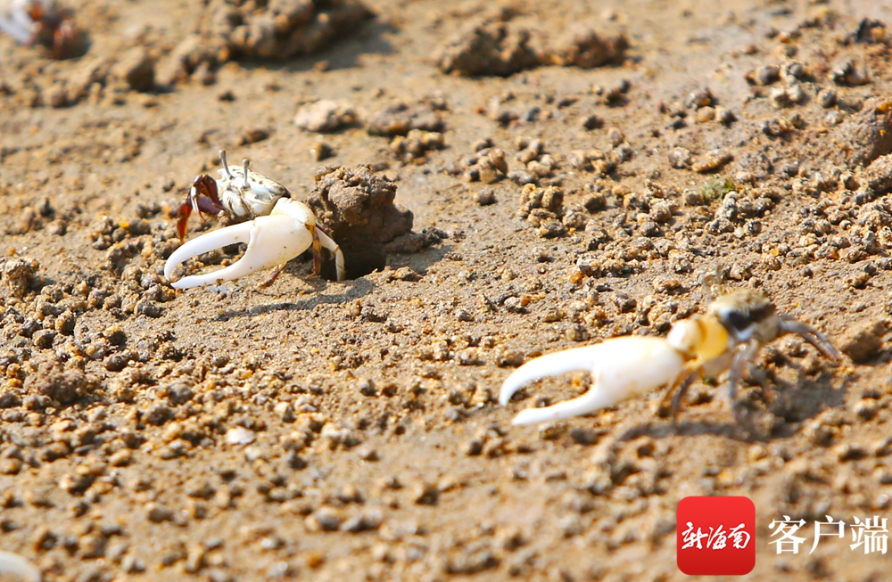 5月22日早上8点多,在海口长堤路的入海口,因为退潮海滩裸露出来,螃蟹成群结队在岸边“玩耍”,这些螃蟹只有一只蟹钳,有的白的诱人,有的通红,蟹钳的大小比螃蟹还要大出一圈。
