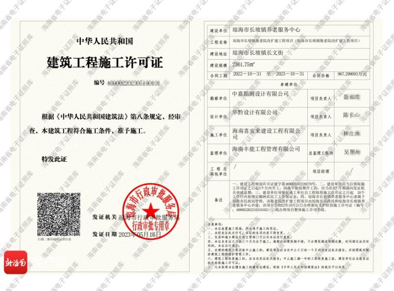 5月22日消息 “之前只是听人常说项目审批跑出‘加速度’,到了来报批项目才真正体会到,这项审批改革堪称‘火箭式’速度了。”5月22日,当琼海市长坡敬老院改扩建的建设单位项目负责人陆慧丽,从琼海市行政审批服务局工程室负责人手中接过建筑施工许可证时说,琼海市工程建设项目审批推行“项目共建”改革,破解工程建设项目审批堵点,真正做到让企业少跑腿。