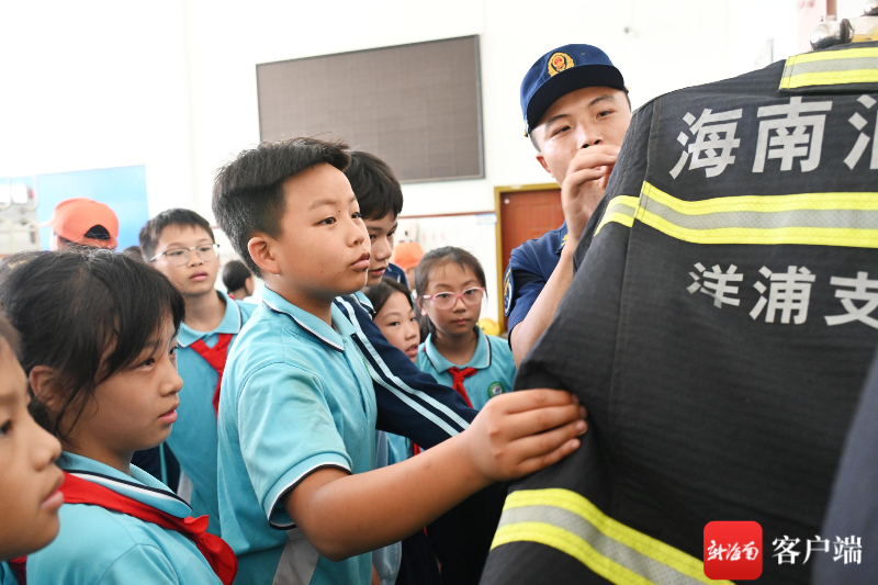 学生体验登高消防车。洋浦消防供图 随后,学生们在消防员的带领下参观了车库,实地观看了消防车与车上的器材装备。消防员详细讲解了每一辆消防车名称、功能及车内各类救援器材和在灭火救援任务中的用途,并在此过程向学生们进行了消防安全知识宣讲。部分学生在消防员的指导下,试穿了消防员的防护头盔、防护服等装备,“这衣服好沉,不知道消防员叔叔怎么做到穿着这身衣服还能跑这么快。”现场一名学生表示,不仅体验了一把当“消防员”的感觉,还切身体会到消防员面对大火时的英勇无畏、敢于吃苦的精神。此外,活动现场还准备了45米登高平台消防车,学生们在消防员的指导和陪同下,穿戴防护装备后依次登上了登高消防车,“零距离”感受了高空救援过程。