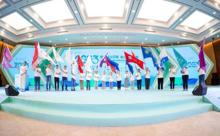 北京大学文化产业研究院副院长、北京大学新闻与传播学院党委书记唐金楠发言 活动最后,与会领导共同宣布大赛启动,20个大赛出征高校的学生代表持校旗上台,挥舞校旗准备“出征”。