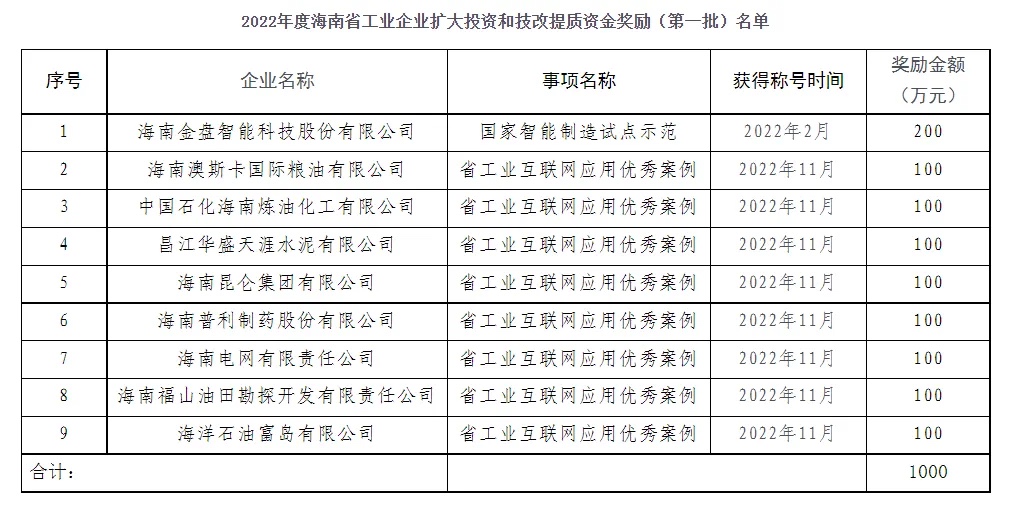 日前,海南省工信厅公示2022年度海南省工业企业扩大投资和技改提质资金奖励(第一批)名单,按照有关程序拟对中国石化海南炼油化工有限公司等获得国家工业互联网试点示范,国家智能制造、服务型制造、绿色工厂等试点示范的9家企业开展第一批资金奖励,拟奖励金额分别为100万元、200万元不等。公示期自2023年5月23日至5月29日。