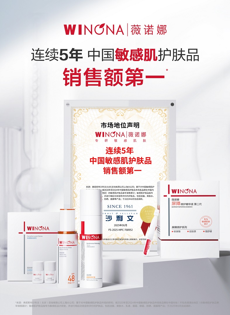 作为专研敏感肌的护肤品牌,薇诺娜同样在敏感肌市场经历长期技术爬坡的历练。近日,经权威机构沙利文认证,薇诺娜已连续五年(2020-2024)中国敏感肌护肤品销售额第一,印证了品牌多年深耕皮肤医学、临床实证和药植科技构筑的专业壁垒。